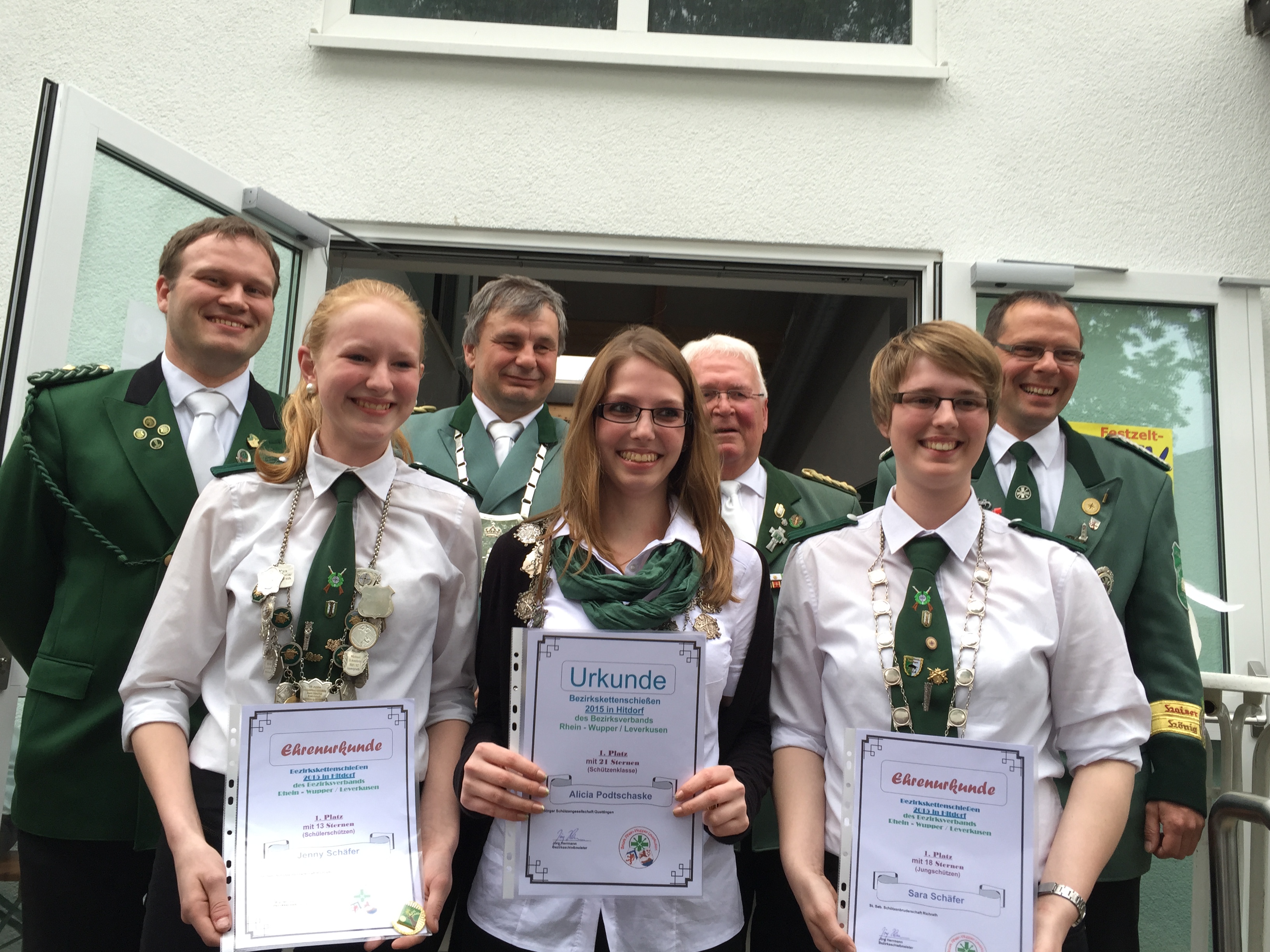 Als es dann am Abend zur Siegerehrung vor dem Schützenhaus kam, konnte sich besonders die Bruderschaft Richrath freuen, die in allen drei Altersklassen die Mannschaftswertung gewinnen konnte. Zudem stellt die Bruderschaft Richrath mit Jenny Schäfer (Schülerschützen) und Sara Schäfer (Jungschützen) auch zwei der drei Bezirkskettenträger 2015-2018.
