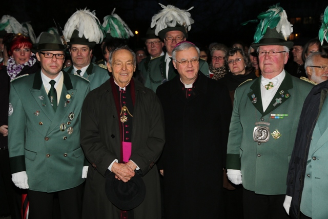Am vergangenen Sonntag beging unser Bezirkspräses Prälat Erich Läufer sein Diamantenes Priesterjubiläum in der Pfarrkirche St. Joseph in Manfort. Zusammen mit ihm zelebrierten sieben Priester seines Weihejahrgangs die Heilige Messe, unter ihnen auch der emeretierte Kölner Weihbischof Dr. Klaus Dick. Die Festpredigt in der Hl. Messe hielt der Bundespräses der Historischen Deutschen Schützenbruderschaften, Bischof Dr. Heiner Koch. Die Feierlichkeit war eine der letzten für Bischof Koch im Erzbistum Köln, da eine Woche später seine Einführung als neuer Bischof von Dresden und Meißen stattfindet.